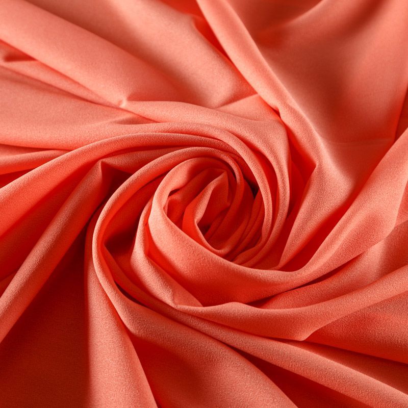 Крепдешин яркого кораллового оттенка, тонкий, легкий, фактурный, приятный на ощупь. Очень пластичный, тянется за счет эластана в составе, прекрасно драпируется и струится. Ткань слегка просвечивает, можно использовать подклад. Идеально будет смотреться в платье, юбке, тунике, рубашке или блузке.