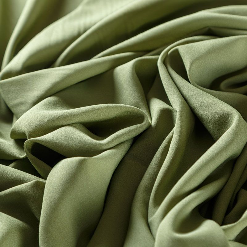 Крепдешин зеленого оттенка, тонкий, легкий, фактурный, приятный на ощупь. Очень пластичный, тянется за счет эластана в составе, прекрасно драпируется и струится. Ткань слегка просвечивает, можно использовать подклад. Идеально будет смотреться в платье, юбке, тунике, рубашке или блузке.