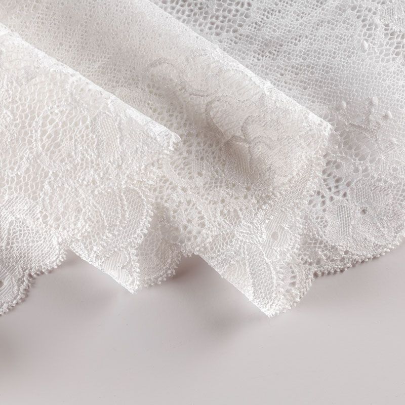 Эластичное кружево сочетает в себе мягкость, прочность и красоту, благодаря своей упругости оно долго не теряет первоначальную форму. Используется для пошива нижнего белья, а так же применяется как отделочный декор в одежде.