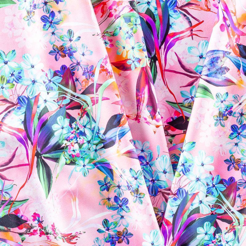 Итальянский бифлекс с цветочным принтом в голубых оттенках на нежном розовом фоне. Поверхность ткани матовая и гладкая. Отлично тянется, одежда из него не сковывает движения. Хорошо впитывает влагу и быстро высыхает, не вызывет аллергии и раздражения. Используется для пошива эстрадных, спортивных костюмов, купальников, боди.