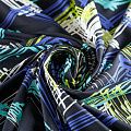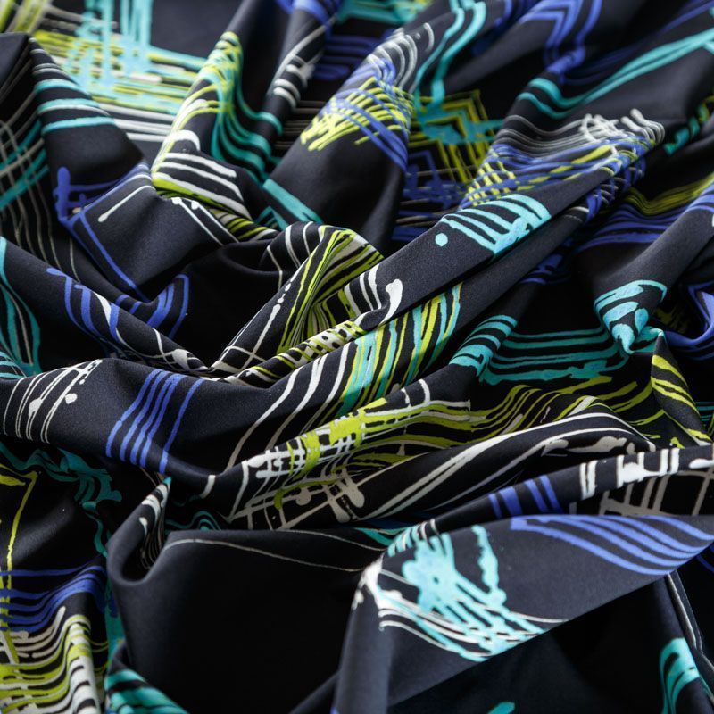 Итальяская качественная, красивая и приятная на ощупь лайкра черного цвета со стильным абстактным принтом в ярких неоновых оттенках. Поверхность ткани матовая и гладкая. Идеально облегает фигуру, тянется по двум направлениям, хорошо драпируется, отлично держит форму, устойчива к пилингу, долговечна и гигроскопична. Используется для пошива одежды для танцев, гимнастики, фигурного катания, для велоспорта, легкой атлетики и аэробики, фитнеса и других видов спорта, для купальников, женского белья, театральных, цирковых и эстрадных костюмов.