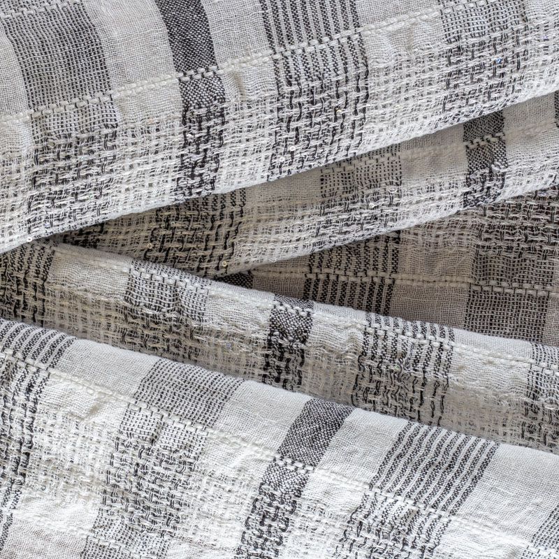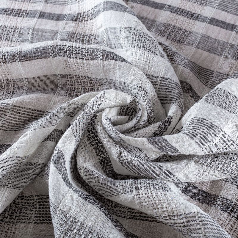 Итальянский лен с добавлением вискозы средней плотности со сложной "клетчатой" геометрией в черно-белых оттенках декорирован мелкими пайетками. Различная толщина нитей создает эффектную фактуру. Ткань пластичная, гибкая за счет плетения,  матовая, мягкая, приятная на ощупь, не рыхлая, комфортная в изделии. Отлично подойдет для пошива летних костюмов, рубашек, туник, платьев, сарафанов, юбок, жакетов, брюк или шорт, легкого пальто.