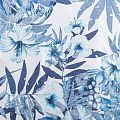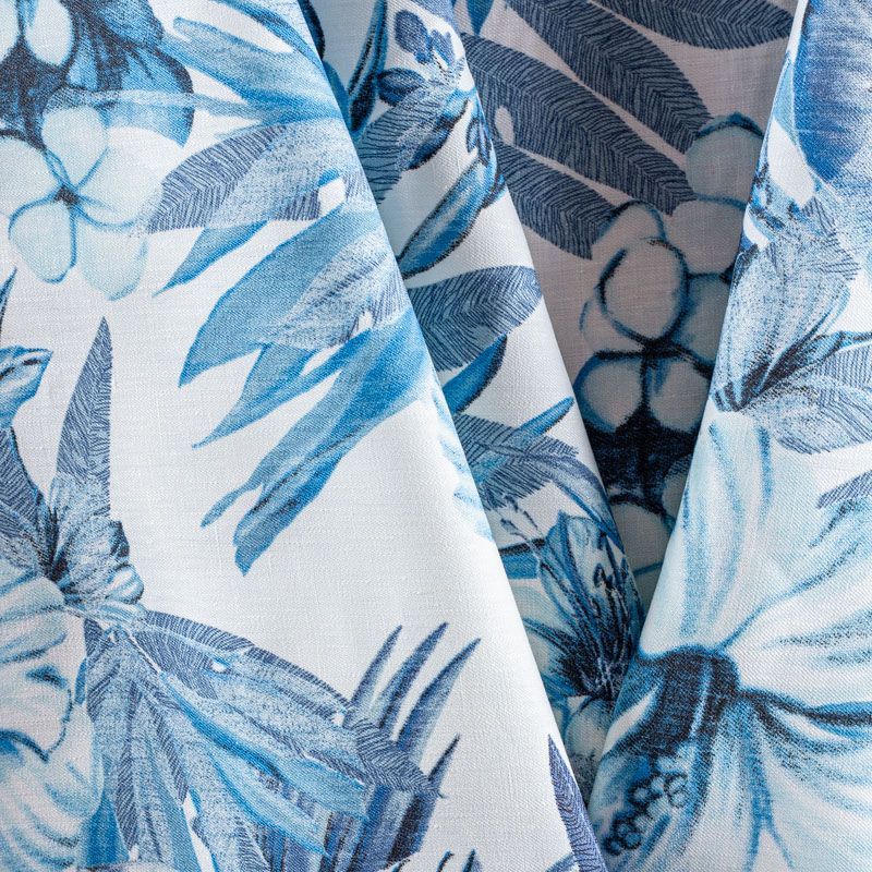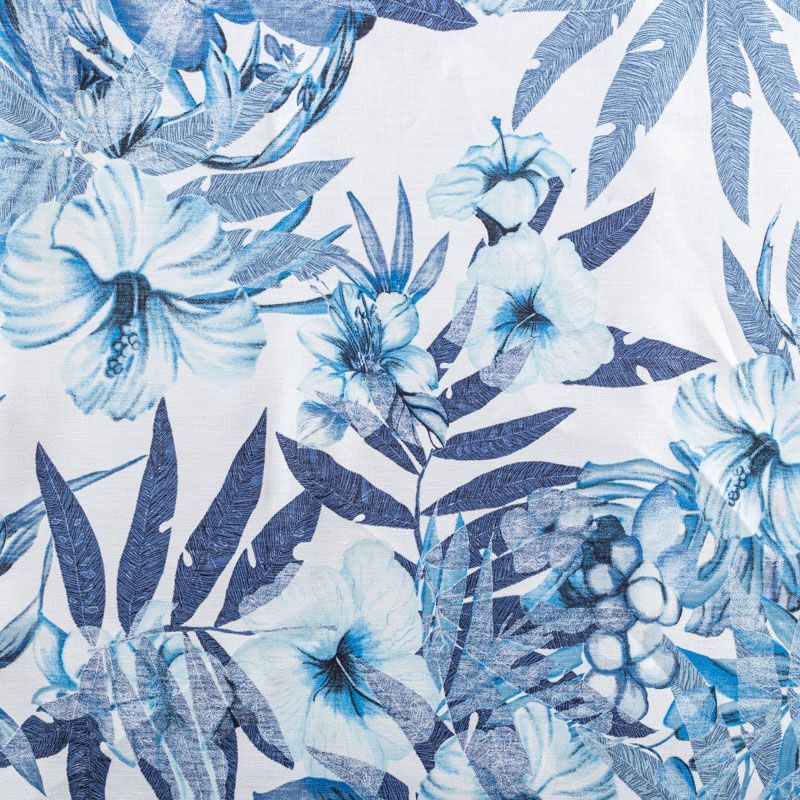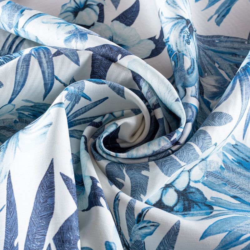 Льняная костюмно-плательная ткань с эффектным тропическим принтом в сине-голубых оттенках на молочном фоне. Ткань прочная, имеет матовую рельефную поверхность и полотняное переплетение, отлично держит форму, пластичный, комфортный в изделии. Отлично подойдет для пошива для летних кардиганов, туник, платьев, сарафанов, юбок, жакетов, брюк или шорт.