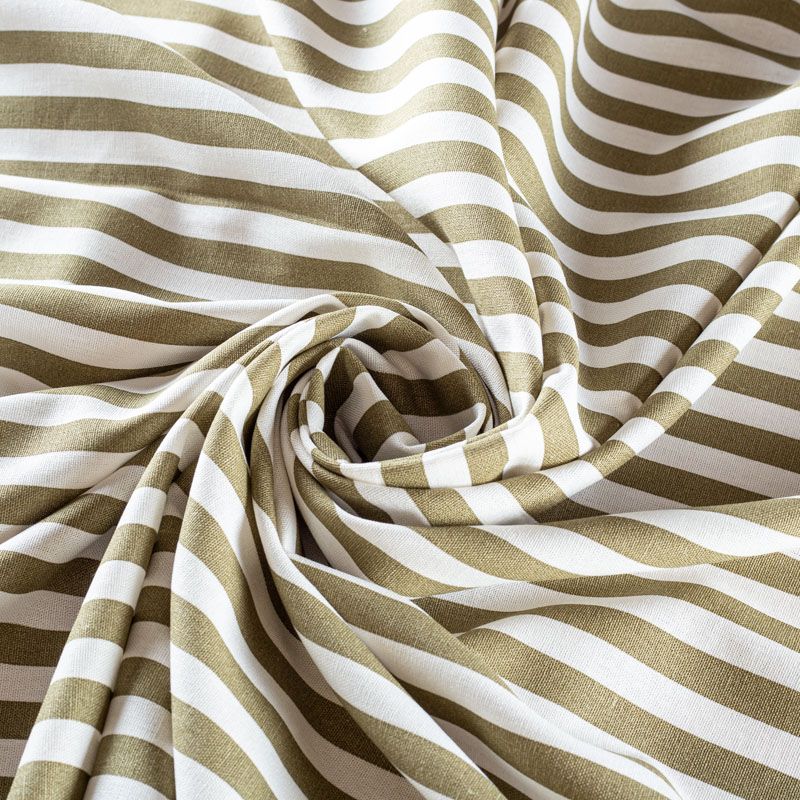 Льняная костюмно-плательная ткань в вертикальную полоску цвета хаки средней ширины. Ткань прочная и плотная, с выразительной матовой рельефной поверхностью и полотняным переплетением, отлично держит форму, комфортная в изделии. Стильный вариант для летних пальто, кардиганов, платьев, сарафанов, юбок, жакетов, брюк или шорт.