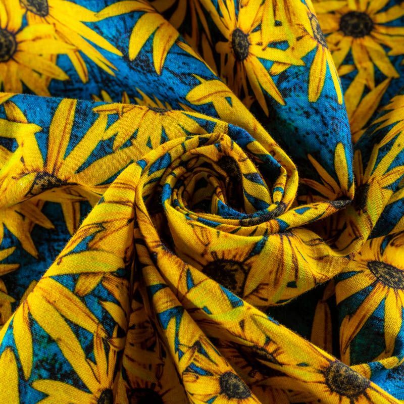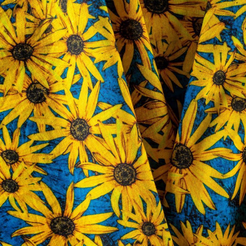 Плательно-рубашечный лен василькового оттенка с ярким солнечным цветочным принтом. Ткань легкая, средней плотности, поверхность матовая. Приятная на ощупь, хорошо держит форму, немного тянется. Отличный вариант для летних платьев, сарафанов, рубашек, брюк или шорт.