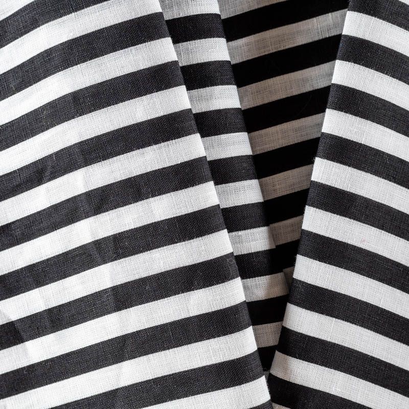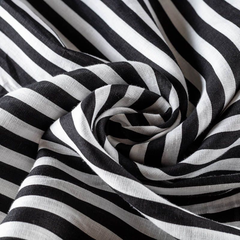 Плательно-рубашечный лен в черно-молочную полоску. Ткань легкая, средней плотности, поверхность матовая. Приятная на ощупь, хорошо держит форму. Отличный вариант для летних  платьев, сарафанов, рубашек, брюк или шорт.