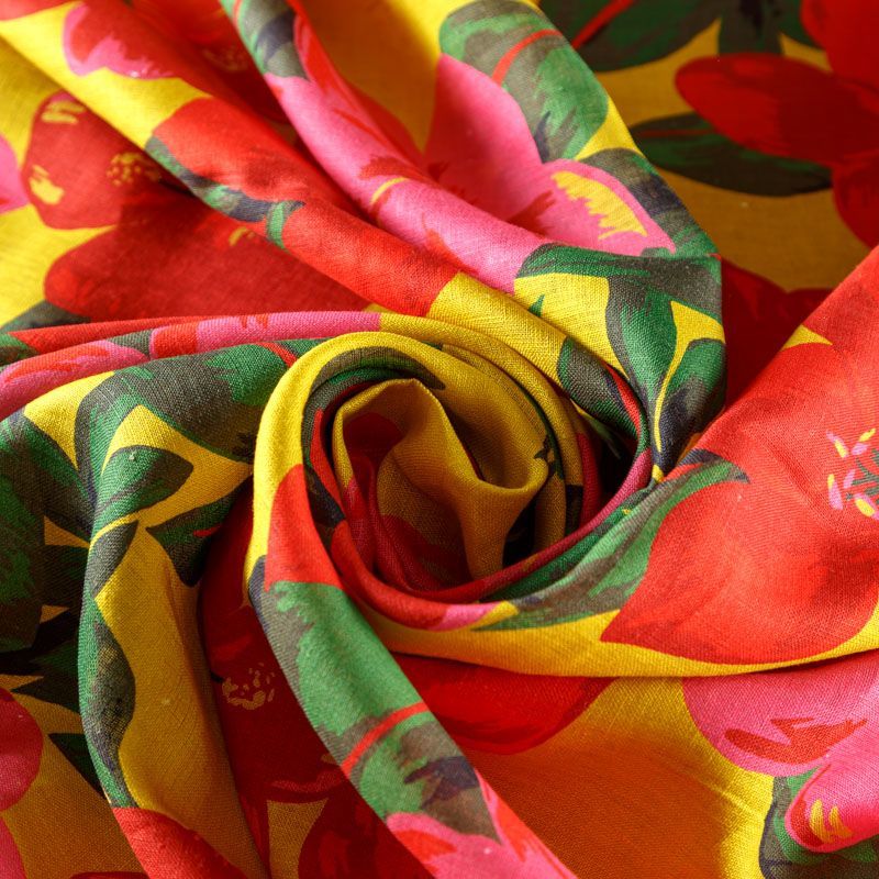 Итальянский плательно-рубашечный лен с добавлением вискозы средней плотности с крупным цветочным принтом в ярких оттенках. Ткань прочная, имеет матовую рельефную поверхность и полотняное переплетение, немного просвечивает, отлично держит форму, пластичная, комфортная в изделии. Отлично подойдет для пошива для летних костюмов, рубашек, туник, платьев, сарафанов, юбок, жакетов, брюк или шорт.