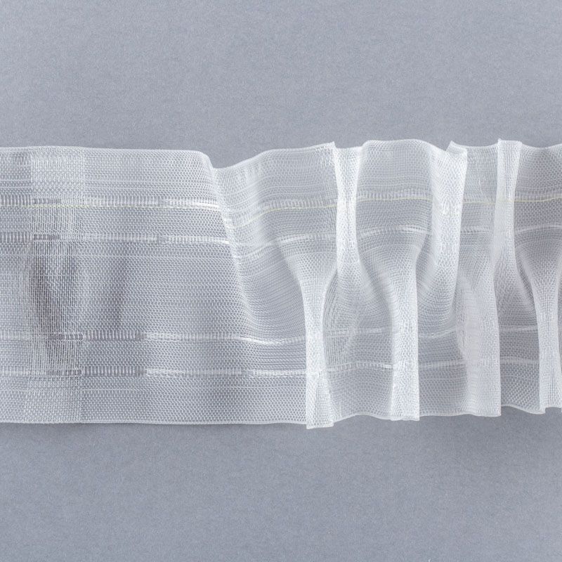 Шторная лента полностью прозрачная для тюлей и легких портьерных тканей с вафельной сборкой. Сокращение - 1:2,5, раппорт - 28 см, 2 ряда кармашков, крепление - крючки.