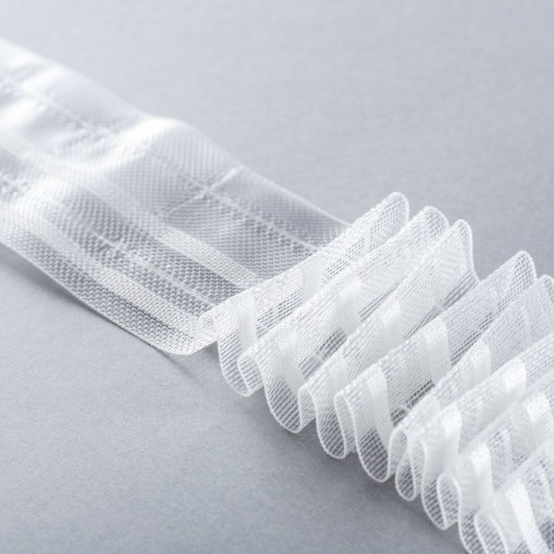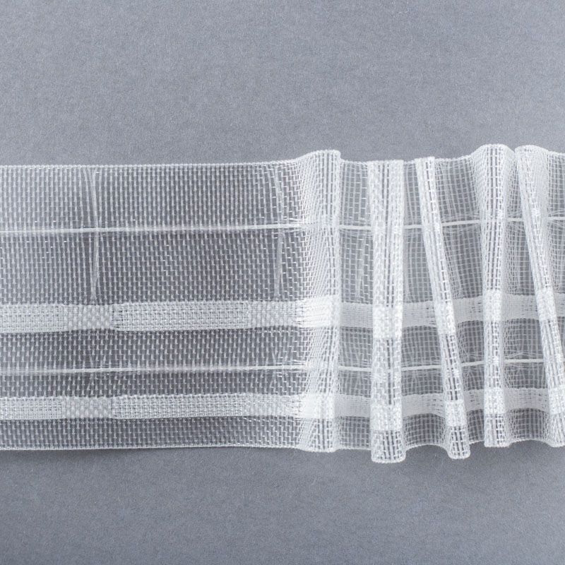 Шторная лента жесткая, прозрачная для тюлей и портьерных тканей c карандашной складкой. Сокращение - регулируемое, произвольное, 2 ряда белых текстильных кармашков, стягивается на 4 нитки, крепление - крючки.