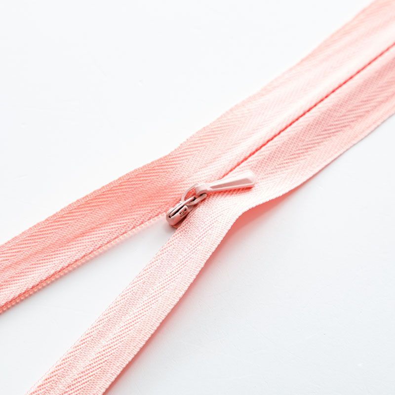 Зубчики потайной молнии скрыты тесьмой, вся конструкция легко прячется в шов изделия. Такие застёжки лучше использовать на вещах из тонкой ткани: платьях, брюках, юбках, блузках. Миниатюрный бегунок сливается с тесьмой и почти невиден для глаз. Зубчики плавно сцепляются, не топорщатся и не застревают.
