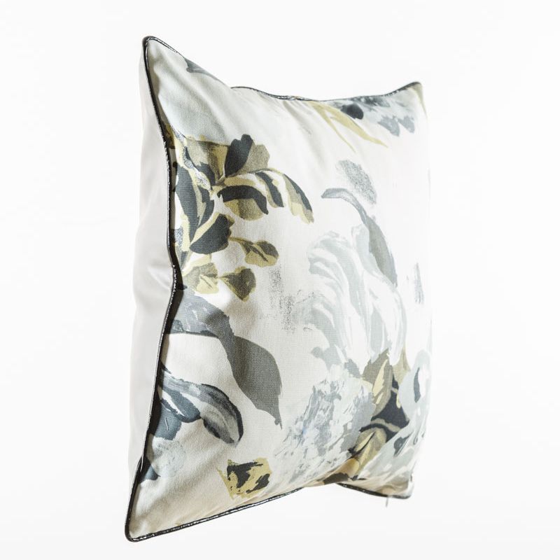 Оригинальная дизайнерская наволочка на подушку 45х45 см. Лицевая сторона выполнена из портьерной ткани в серо-голубых оттенках с акварельным цветочным принтом. Обратная сторона - экокожа светло-серого цвета. Наволочка декорирована черным лакированным кантом. Потайная молния расположена в нижнем шве. Декоративные подушки сделают акцет на цветовой гамме Вашего помещения, подчеркнут особенности интерьерного стиля или тематику оформления. Внимание! Подушка-вкладыш приобретается отдельно.