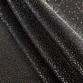 Объемный, эластичный материал черного цвета с золотистым напылением, состоящий из двойной мелкой сетки, по форме напоминающей соты. Упругое, мягкое с полупрозрачной фактурой полотно, пластичное и довольно прочное. Хорошо тянется, легкое и комфортное. Отлично держит форму. Рекомендуется для пошива объемных изделий или элементов: эксклюзивного жакета, бомбера, платья, юбки.