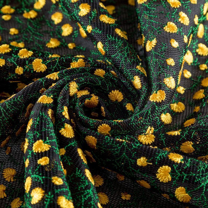 Объемный, эластичный материал черного цвета, состоящий из двойной мелкой сетки, по форме напоминающей соты, украшенный "богатой" цветочной вышивкой. Упругое, мягкое с полупрозрачной фактурой полотно, пластичное и довольно прочное. Хорошо тянется, легкое и комфортное. Отлично держит форму. Рекомендуется для пошива объемных изделий или элементов: эксклюзивного жакета, бомбера, платья, юбки.