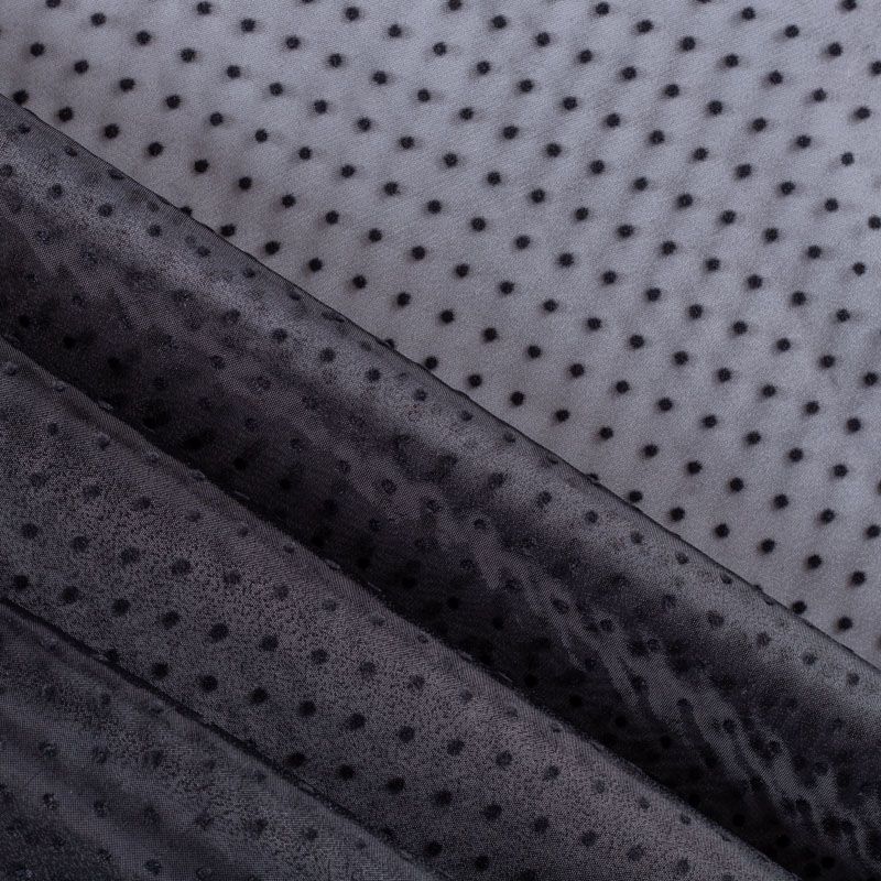 Легчайший, изящный, воздушнный и прозрачный материал с благородной переливчатой поверхностью. Прекрасно держит форму в заложеных складках. На лицевой стороне объемные декоративные элементы из флока диаметром 0.5 см. Подойдет для создания в изделии декоративных деталей, новогодних костюмов, нарядных платьев, блузок.