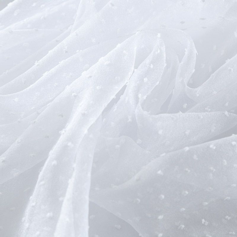 Легчайший, изящный, воздушнный и прозрачный материал с благородной переливчатой поверхностью. Прекрасно держит форму в заложеных складках. На лицевой стороне объемные декоративные элементы из флока диаметром 0.5 см. Подойдет для создания в изделии декоративных деталей, новогодних костюмов, нарядных платьев, блузок.