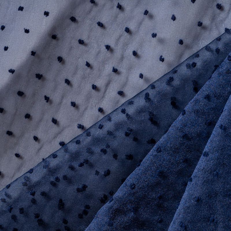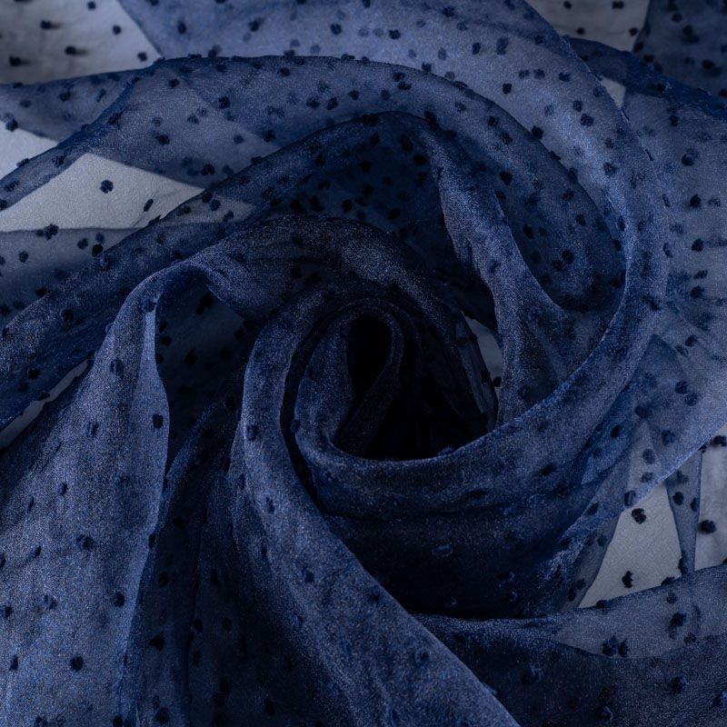 Легчайший, изящный, воздушнный и прозрачный материал с благородной переливчатой поверхностью. Прекрасно держит форму в заложеных складках. На лицевой стороне объемные декоративные элементы из флока диаметром 0.5 см. Подойдет для создания в изделии декоративных деталей, новогодних костюмов, нарядных платьев, блузок.