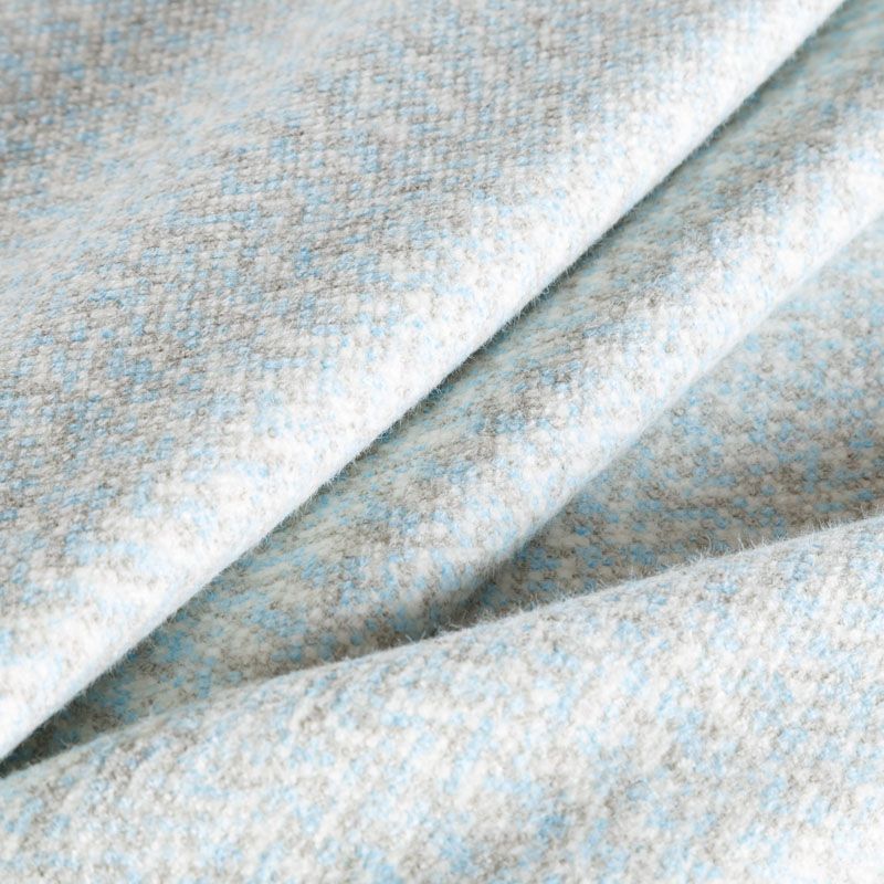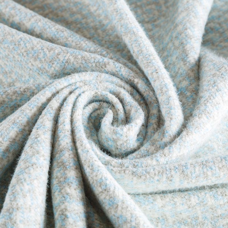 Плотный двухслойный пальтовый трикотаж белого цвета с абстрактным орнаментом в серо-голубой гамме. Ткань очень приятная на ощупь, пластичная, теплая и уютная, поверхность слегка буклированная и мягкая. Изнанка однотонная молочного оттенка. Прекрасно подойдет для  пошива пальто, теплых жакетов, курток, кардиганов, костюмов.