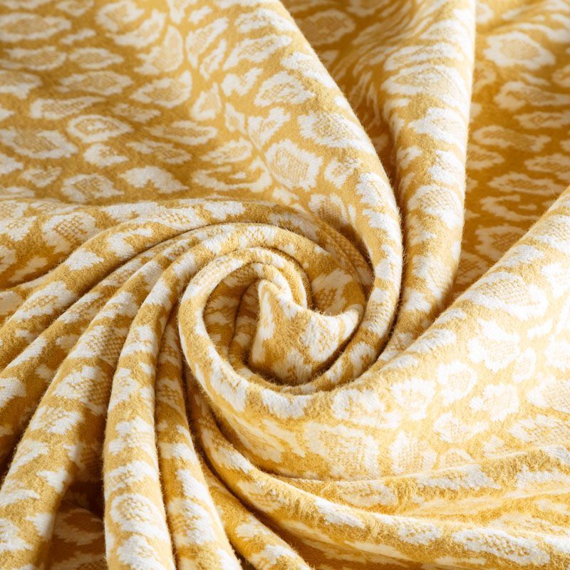 Плотный двухслойный пальтовый трикотаж желтого оттенка со стилизованным анималистическим узором белого цвета. Ткань очень приятная на ощупь, пластичная, теплая и уютная, поверхность мягкая и шелковистая. Изнанка однотонная молочного оттенка. Прекрасно подойдет для пошива пальто, теплых жакетов, курток, кардиганов, костюмов.