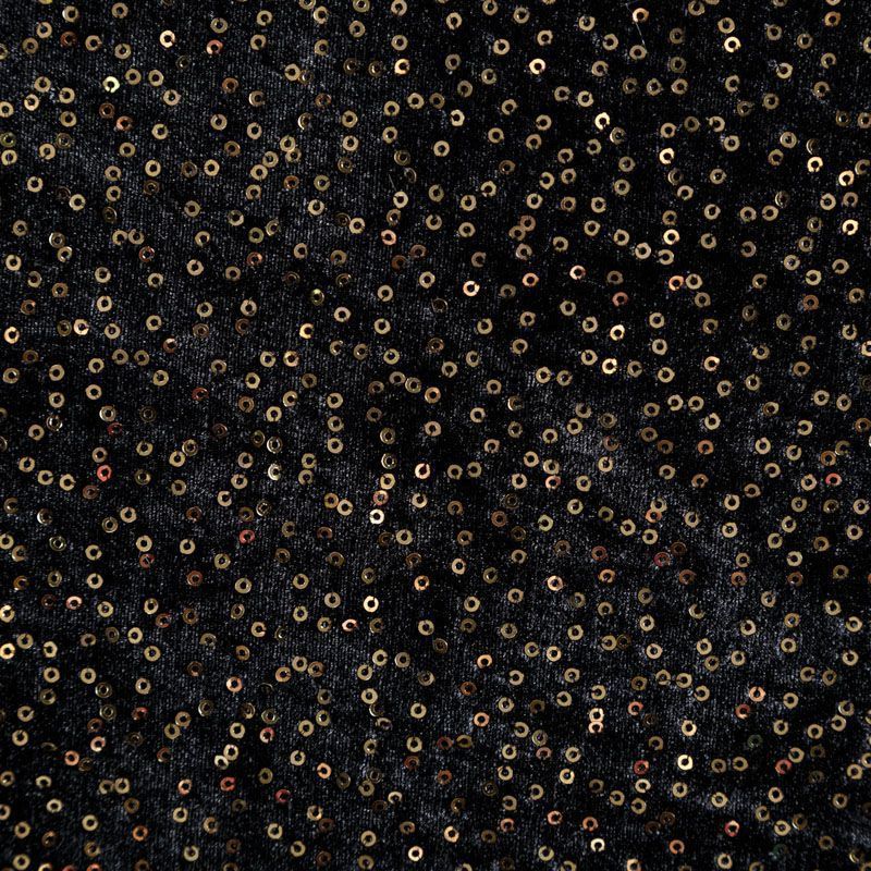 Роскошкный черный бархат с мелкими блестящими пайетками золотистого цвета. Необычное сочетание фактур и итальянское качество делают эту ткань яркой и нарядной. Она очень эластичная, мягкая и пластичная, красиво драпируется и ниспадает. Пайетки отлично подойдут для вечеринок, праздничных вечеров, корпоративов и других мероприятий в качестве платья, брюк, шорт, юбки, жакета, боди, топа, туники или комбинезона.