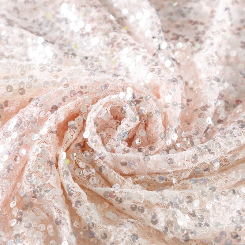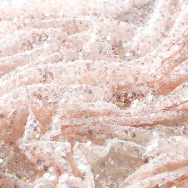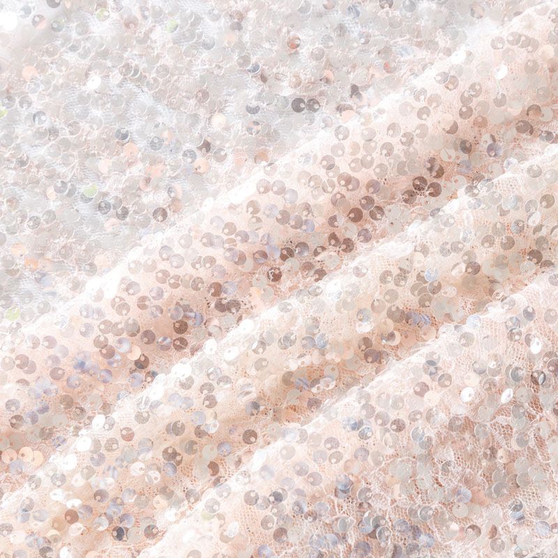 Итальянское ажурное кружевное полотно персикового оттенка с цветочным рисунком и нашитыми на него прозрачными глянцевыми пайетками с лицевой стороны. Ткань полупрозрачная, требуется подклад. Очень мягкая и пластичная, эффектно переливается при движении, хорошо драпируется. Пайетки — идеальный материал для праздников и вечеринок. Из них получится эффектное платье, туника, топ, юбка или комбинезон.