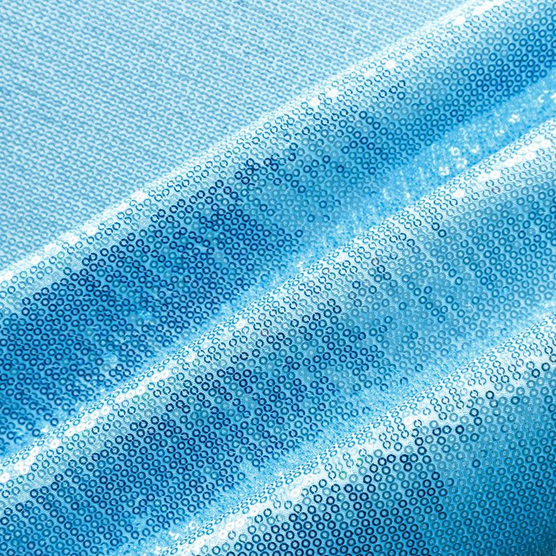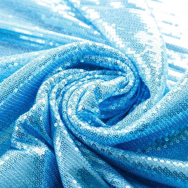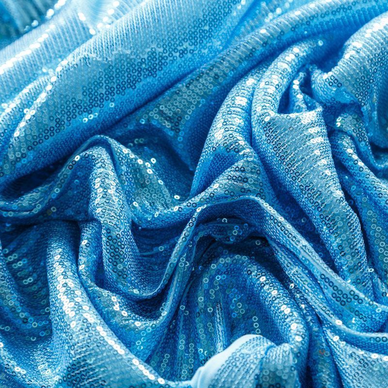 Блестящие пайетки в голубом оттенке. Мелкие, размером около 3 мм, расположены в хаотичном порядке. Основа - мягкая и эластичная сетка.  Ткань полупрозрачная, может потребоваться подклад. Подойдет для вечернего, коктейльного платья, юбки, нарядных детских изделий, танцевальных и сценических костюмов.