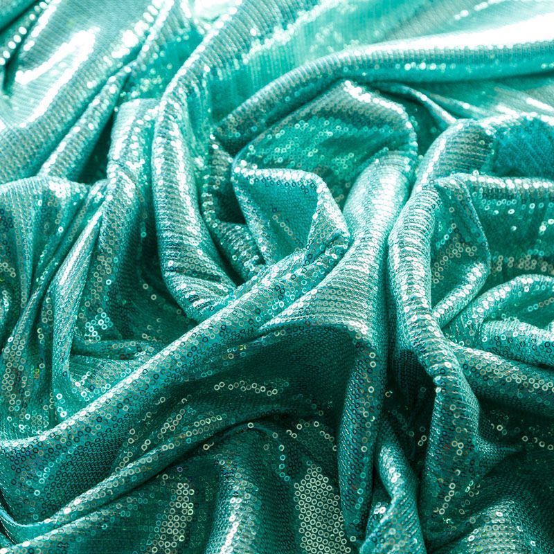 Блестящие пайетки в бирюзовом оттенке. Мелкие, размером около 3 мм, расположены в хаотичном порядке. Основа - мягкая и эластичная сетка. Ткань полупрозрачная, может потребоваться подклад. Подойдет для вечернего, коктейльного платья, юбки, нарядных детских изделий, танцевальных и сценических костюмов.