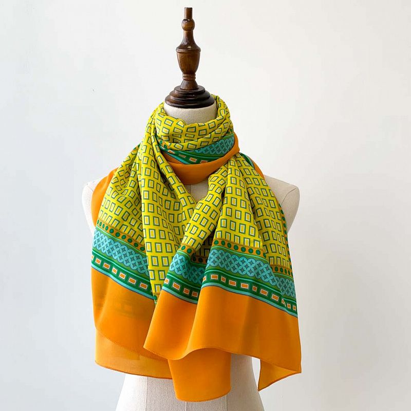 Модный платок с геометрическим рисунком - в эффектном и стильном сочетании акцентов в цветовой гамме. Здесь и белый, и желтый, и яркий зеленый и насыщенный апельсиновый. Платок выполнен из итальянского натурального шелка, поверхность креповая, не прозрачный. Будет эффектным дополнением к любому образу.