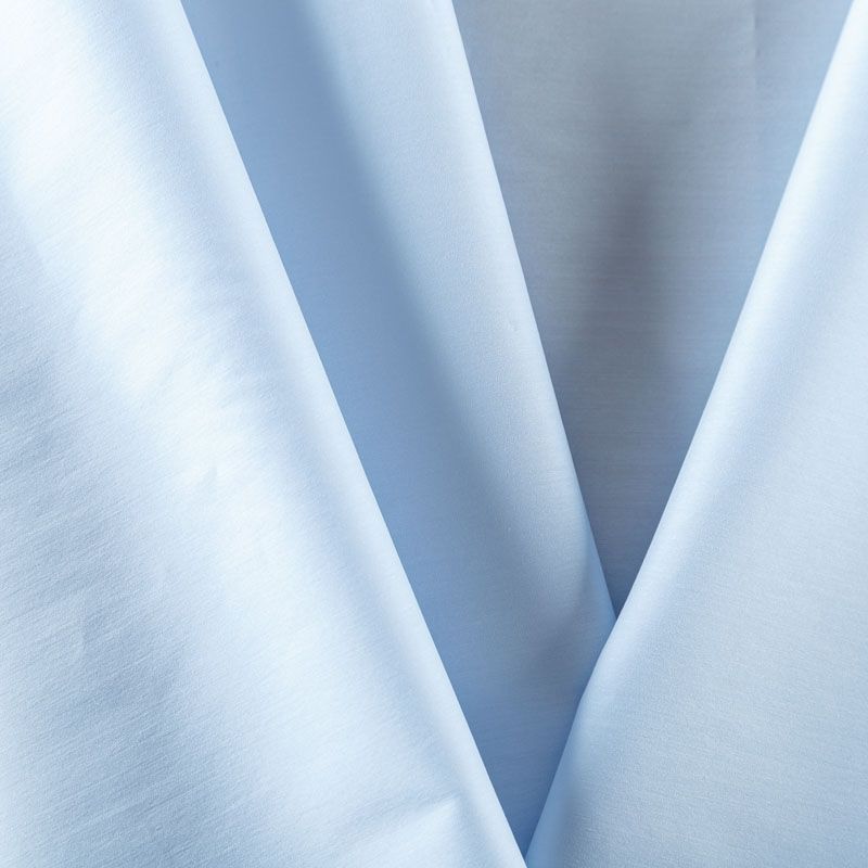 Однотонный плательно-рубашечный смесовый поплин светло-голубого оттенка. Ткань лёгкая, слегка прозрачная, поверхность матовая, гладкая, приятная к телу, хорошо драпируется, тянется за счет эластана в составе. Прекрасно подойдет блузы, платья-рубашки, летнего сарафана, туники.