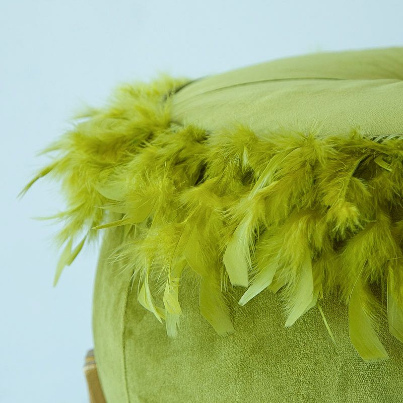 Ориганальный дизайнерский пуф выполнен из бархата грушевого оттенка, декорирован кантом и перьями. Ножки выполнены из окрашенного металлического профиля. Диаметр сидения - 50 см, диаметр в основании - 65 см, высота от пола - 51 см.