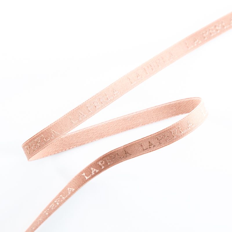 Бретелечная резинка используется для обработки стана бюстгальтера, а также для бретелей. Матовая с жаккардовой надписью бренда. Края ровные.