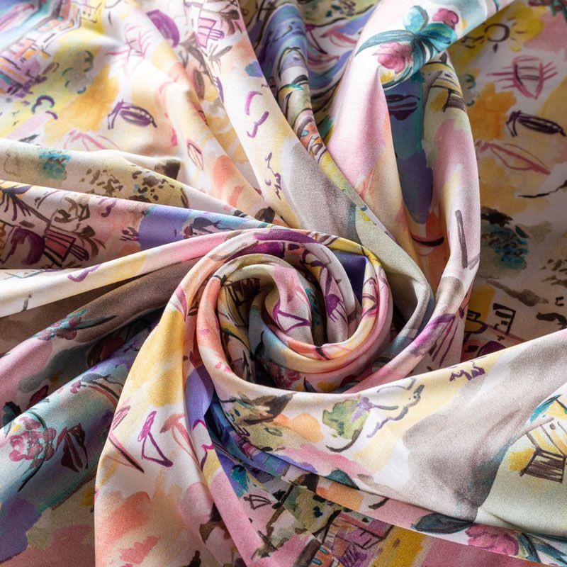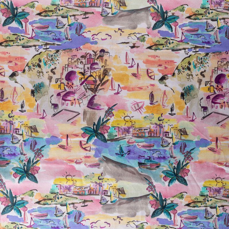 Блузочно-рубашечный хлопок сатинового плетения с акварельным морским пейзажем, который переносит нас на средиземноморское побережье Италии. Ткань тонкая, легкая, слегка прозрачная, мягкая и шелковистая на ощупь. Сатин очень пластичный, хорошо драпируется, немного держит форму. Подойдет для пошива различных предметов летнего гардероба: платья, сарафана, туники, рубашки, топа.