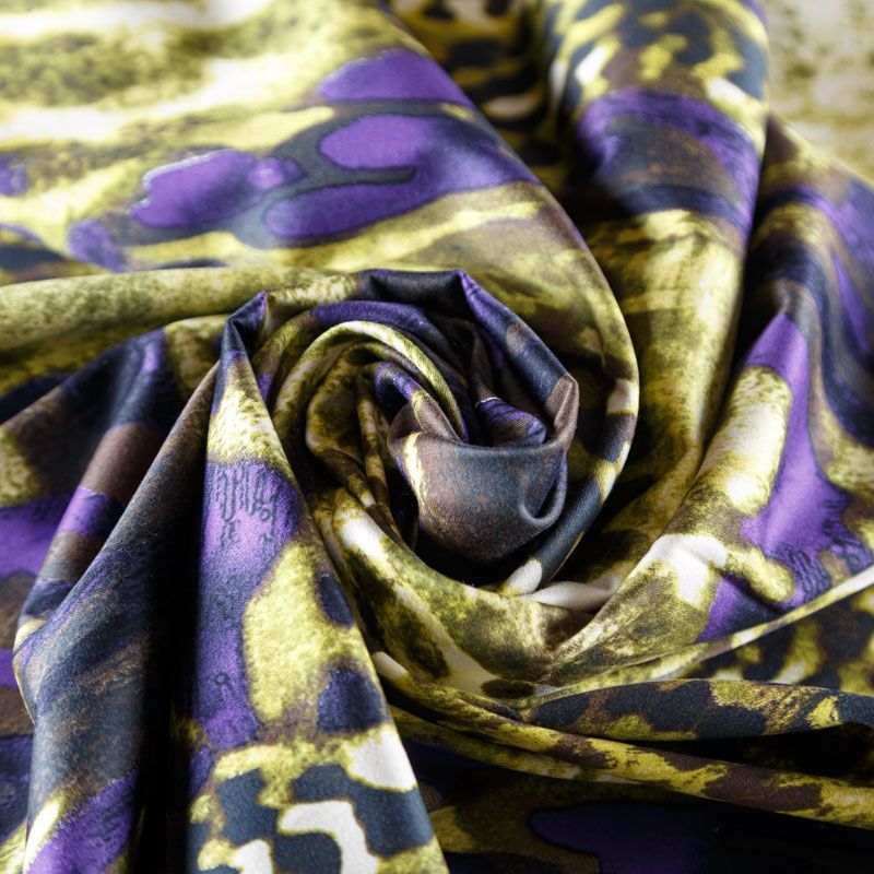 Итальянский сатин-коттон оливкового оттенка с контрастным анималистическим принтом. Поверхность гладкая со сдержанным блеском, ткань средней плотности, не толстая, хорошо держит форму, тянется за счет эластана в составе. Подойдет для пошива костюма, жакета, юбки, платья, брюк или шорт.