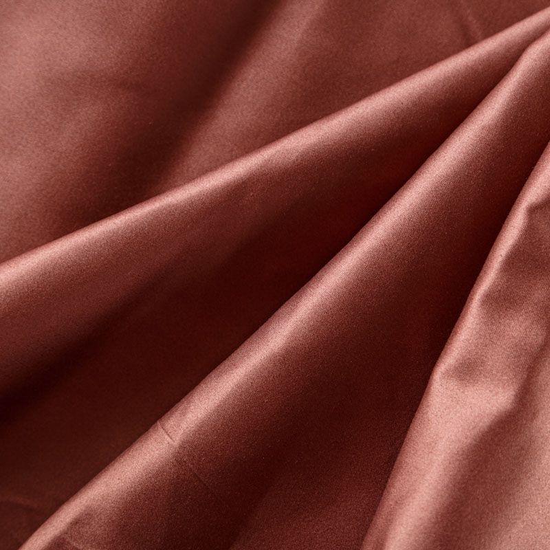 Сатин-коттон в коричневом оттенке, с гладкой поверхностью со сдержанным блеском, ткань средней плотности, не толстая, хорошо держит форму, тянется за счет эластана в составе. Подойдет для пошива костюма, жакета, юбки, платья, брюк или шорт.