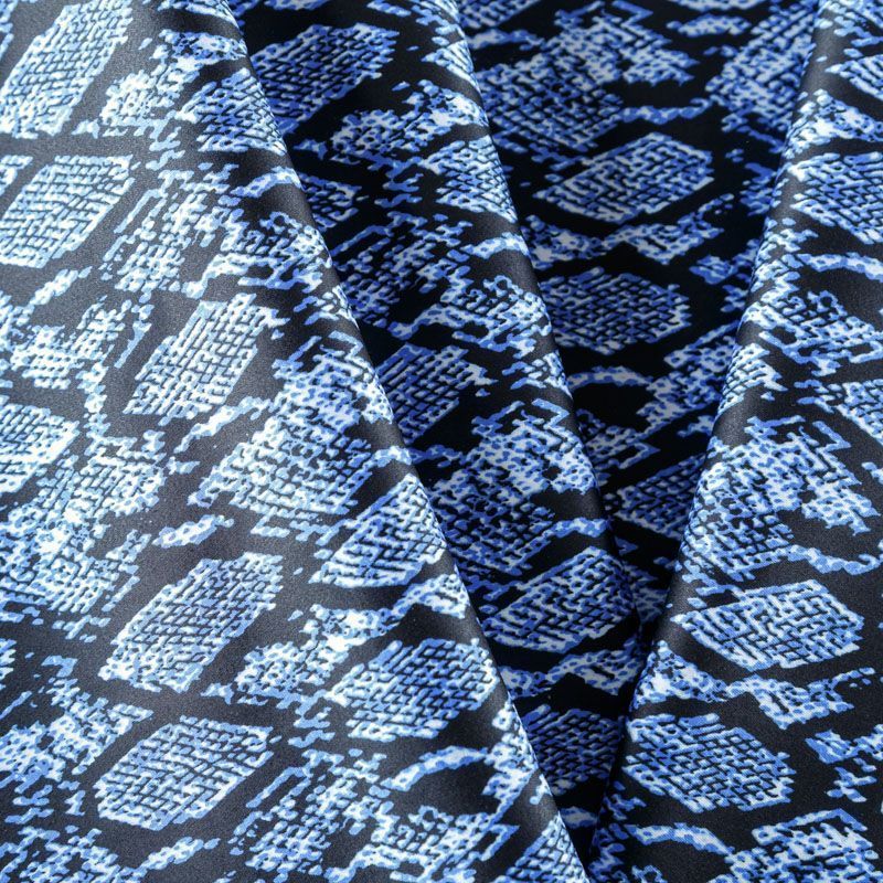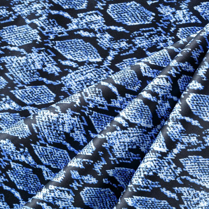 Сатин-коттон черного цвета со стилизованным анималистическим принтом, с гладкой поверхностью со сдержанным блеском, ткань средней плотности,  не толстая, хорошо держит форму, тянется за счет эластана в составе. Подойдет для пошива костюма, жакета, юбки, платья, брюк или шорт.