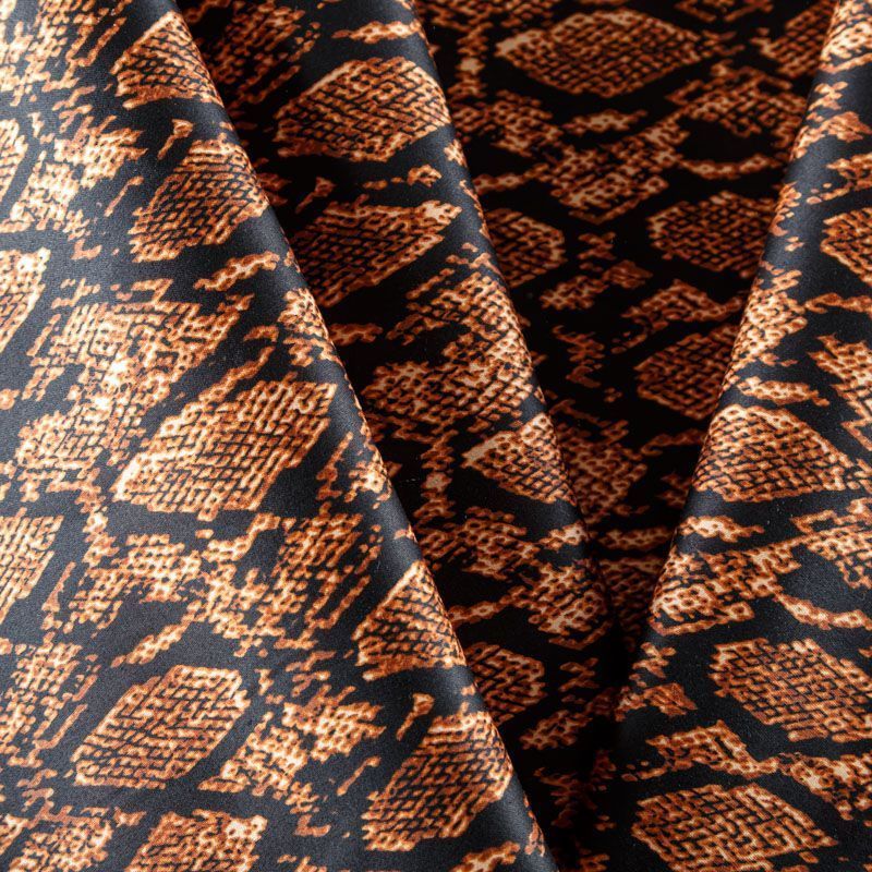 Сатин-коттон черного цвета со стилизованным анималистическим принтом, с гладкой поверхностью со сдержанным блеском, ткань средней плотности,  не толстая, хорошо держит форму, тянется за счет эластана в составе. Подойдет для пошива костюма, жакета, юбки, платья, брюк или шорт.