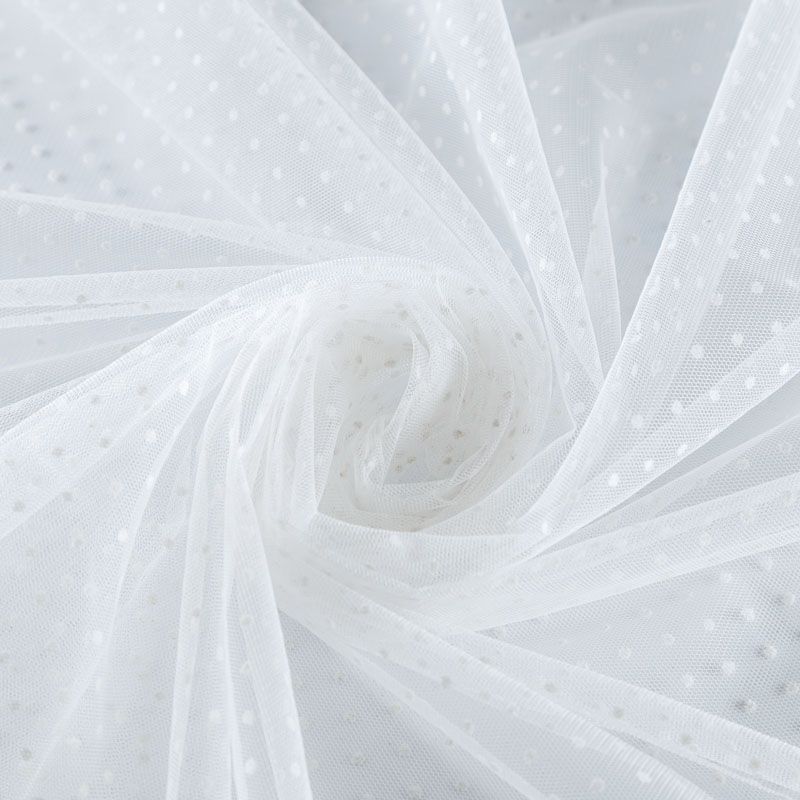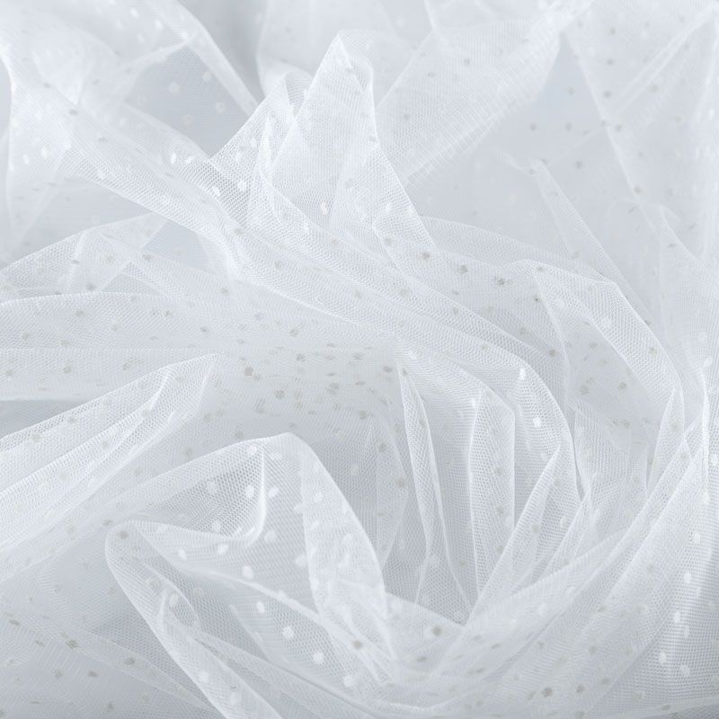Тонкое, нежное, мягкое и прозрачное полотно, состоящее из мелких ячеек, на которых нанесены рельефные горошины.  Красиво драпируется, тянется, применяется для декорирования деталей одежды, например, рукавов изделия, для пошива нарядной и повседневной одежды: топов, блузок, пышных юбок и платьев.