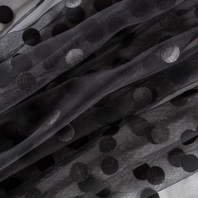 Тонкое, нежное, мягкое и прозрачное полотно, состоящее из мелких ячеек, на которых нанесен рельефный плетеный принт в виде гороха. Размер горошка - 1,5 см. Ткань красиво драпируется, тянется, применяется для декорирования деталей одежды, например, рукавов изделия, для пошива нарядной и повседневной одежды: топов, блузок, пышных юбок и платьев.