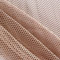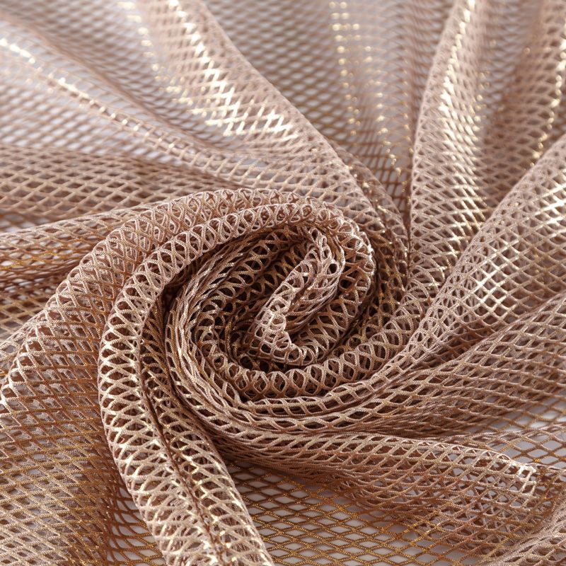 Рельефный полупрозрачный материал с сетчатой структурой. Поверхность полотна с металлизированным золотым напылением, которое придает материалу легкий блеск и мерцание. Полотно мягкое, растяжимое во всех направлениях. Сетки нашли свое применение в процессе пошива и последующего декора вечерних нарядов, свадебных платьев, спортивной одежды, театральных костюмов.