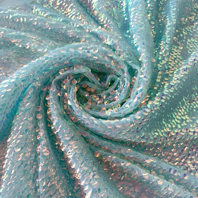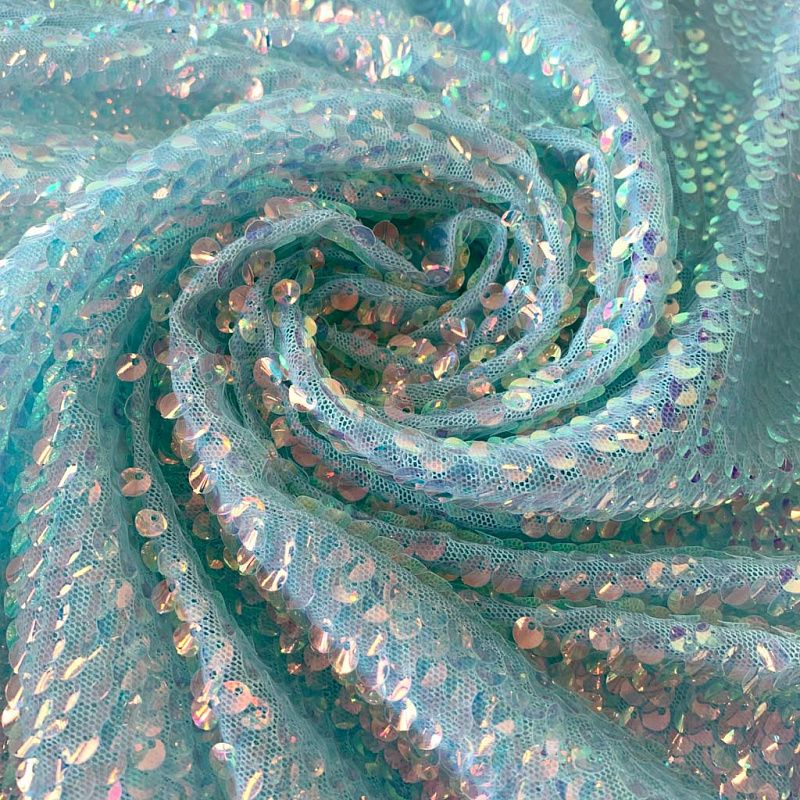 Тонкая эластичная сетка мятного цвета по всей поверхности усеяна объемными глянцевыми "бензиновыми" пайетками. Ткань очень хорошо драпируется, красиво переливается, имеет глянцевый блеск, пластичная и эластичная и в длину, и в ширину, набираются объемом. Пайетки — идеальный материал для праздников и вечеринок. Из них получится эффектное платье, жакет, боди, туника, юбка или комбинезон.