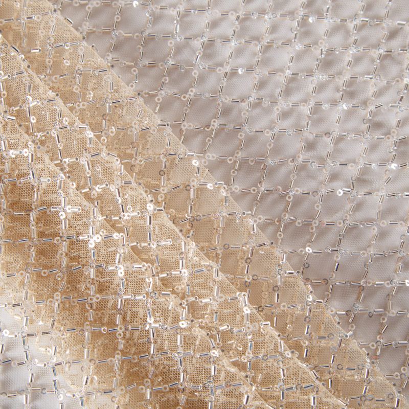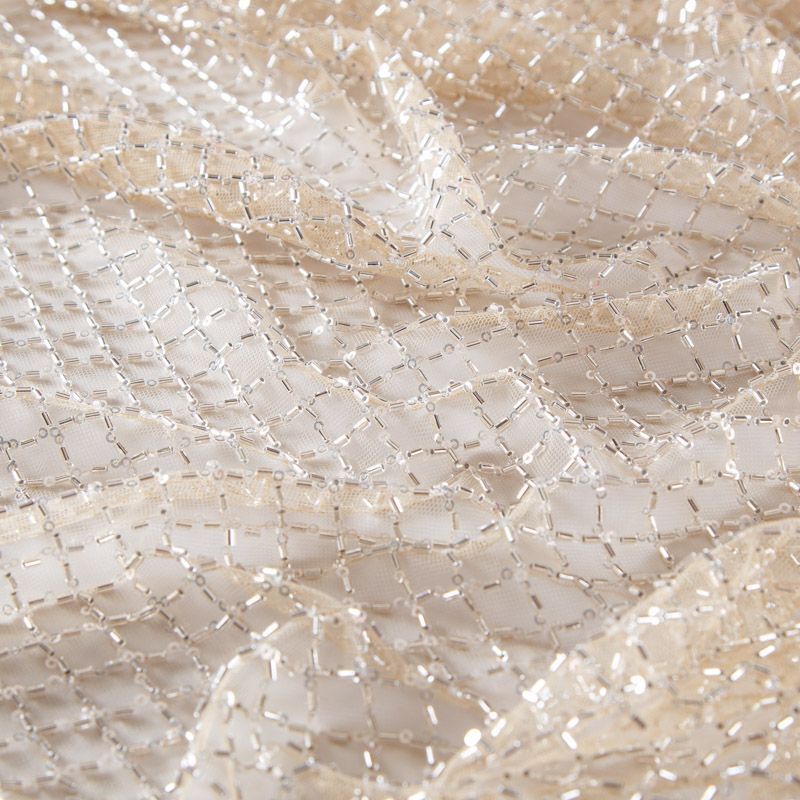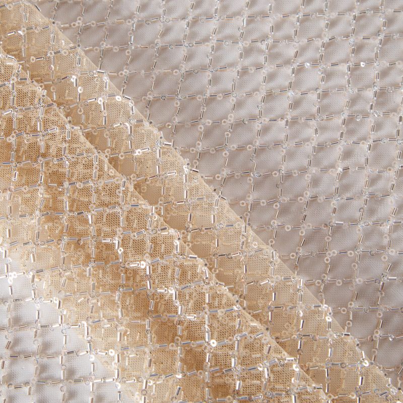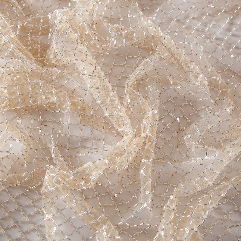 Эластичная мягкая сетка золотистого оттенка, расшитая стеклярусом и пайетками в тон основы. Геометрический дизайн делает полотно универсальным в использовании. Итальянская сетка прекрасно подходит для пошива праздничных нарядов, платьев, юбок и топов для торжественных случаев, а также отделки аксессуаров.