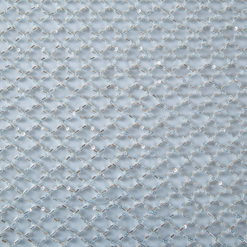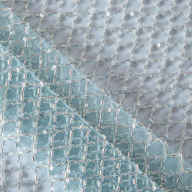 Эластичная мягкая сетка мятного оттенка, расшитая прозрачным стеклярусом. Геометрический дизайн делает полотно универсальным в использовании. Итальянская сетка прекрасно подходит для пошива праздничных нарядов, платьев, юбок и топов для торжественных случаев, а также отделки аксессуаров.