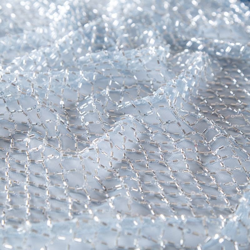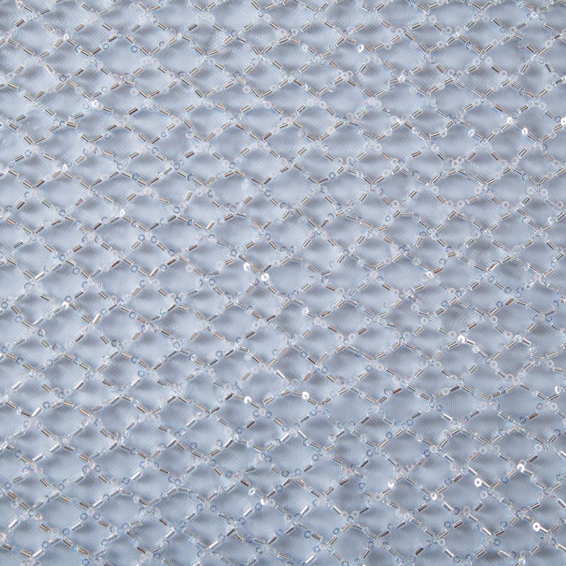 Эластичная мягкая сетка голубого оттенка, расшитая прозрачным стеклярусом. Геометрический дизайн делает полотно универсальным в использовании. Итальянская сетка прекрасно подходит для пошива праздничных нарядов, платьев, юбок и топов для торжественных случаев, а также отделки аксессуаров.