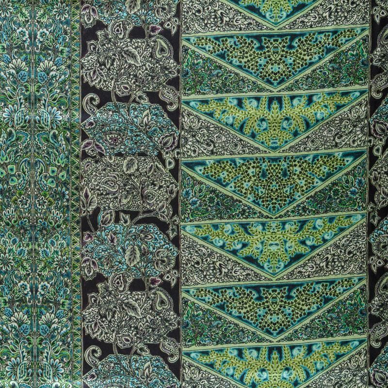 Итальянский атласный шелк с богатым орнаментом в зеленых оттенках. Ткань тонкая, не просвечивает, отлично драпируется, легкая и струящаяся, тянется за счет эластана в составе. Идеально подойдет для пошива платьев и сарафанов расклешенных моделей, с воланами, летящих юбок, топов, блузки, костюма в пижамном стиле.