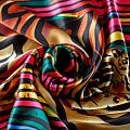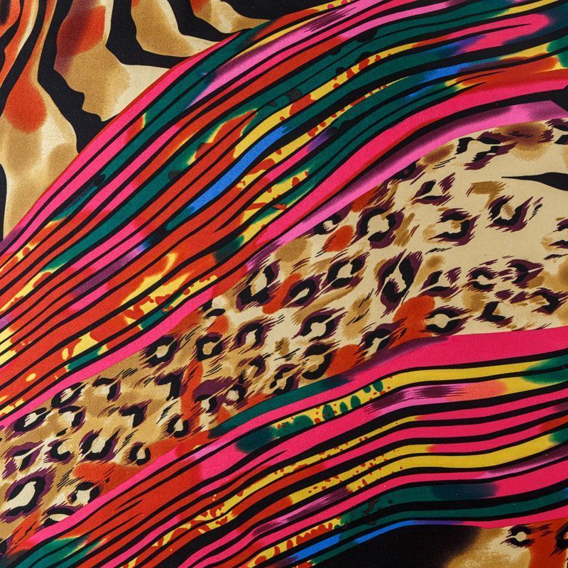 Итальянский атласный шелк с ярким абстрактным принтом на золотистом фоне. Ткань тонкая, не просвечивает, отлично драпируется,  легкая и струящаяся. Идеально подойдет для пошива платьев и сарафанов расклешенных моделей, с воланами, летящих юбок, топов, блузки, костюма в пижамном стиле.