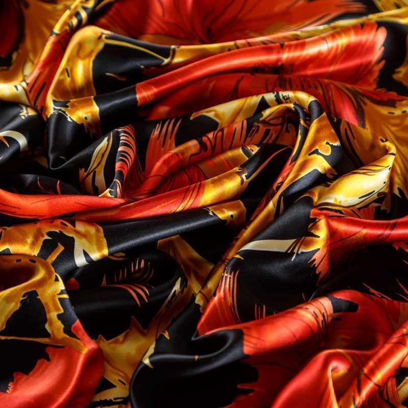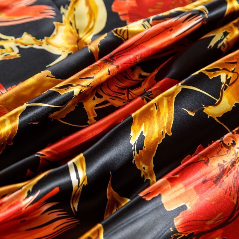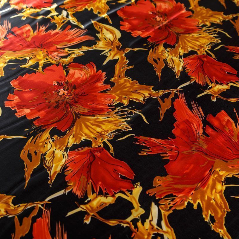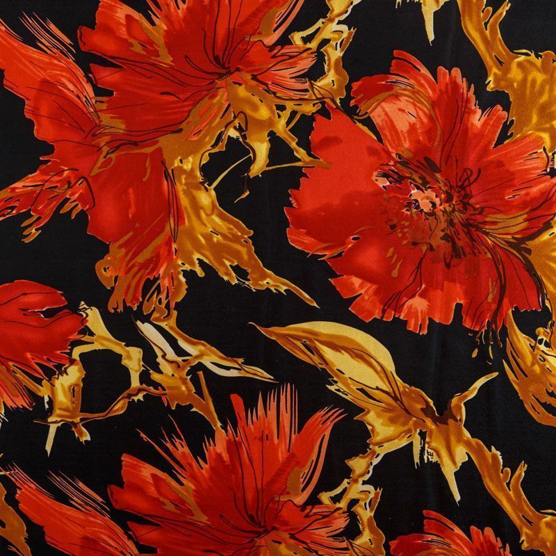 Итальянский атласный шелк с ярким цветочным принтом на черном фоне. Ткань тонкая, не просвечивает, отлично драпируется, легкая и струящаяся. Идеально подойдет для пошива платьев и сарафанов расклешенных моделей, с воланами, летящих юбок, топов, блузки, костюма в пижамном стиле.