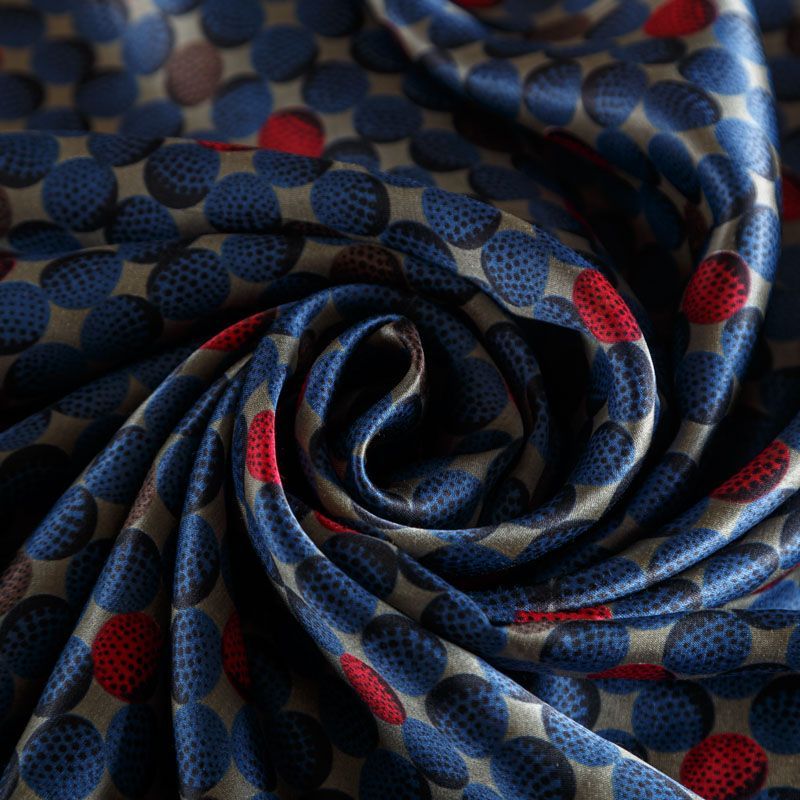 Итальянский атласный шелк с геометрическим принтом на фоне цвета хаки. Ткань тонкая, не просвечивает, отлично драпируется, легкая и струящаяся. Идеально подойдет для пошива платьев и сарафанов расклешенных моделей, с воланами, летящих юбок, топов, блузки, костюма в пижамном стиле.