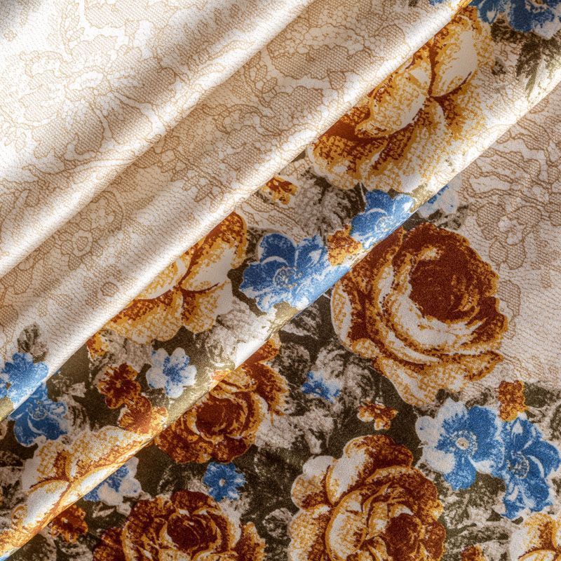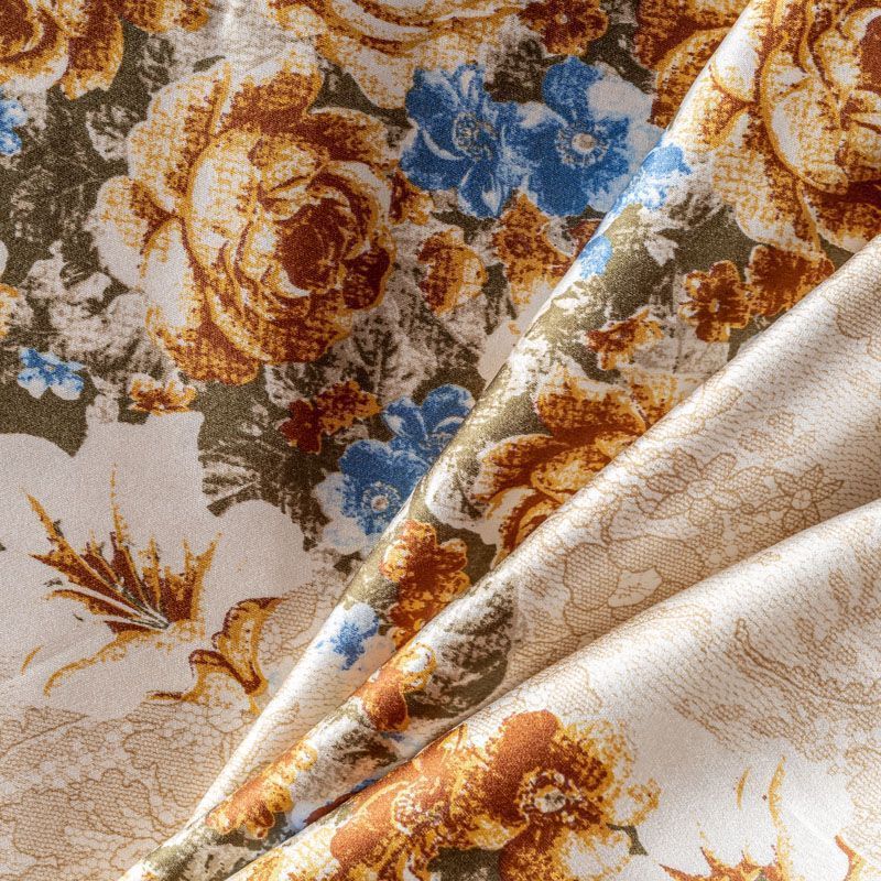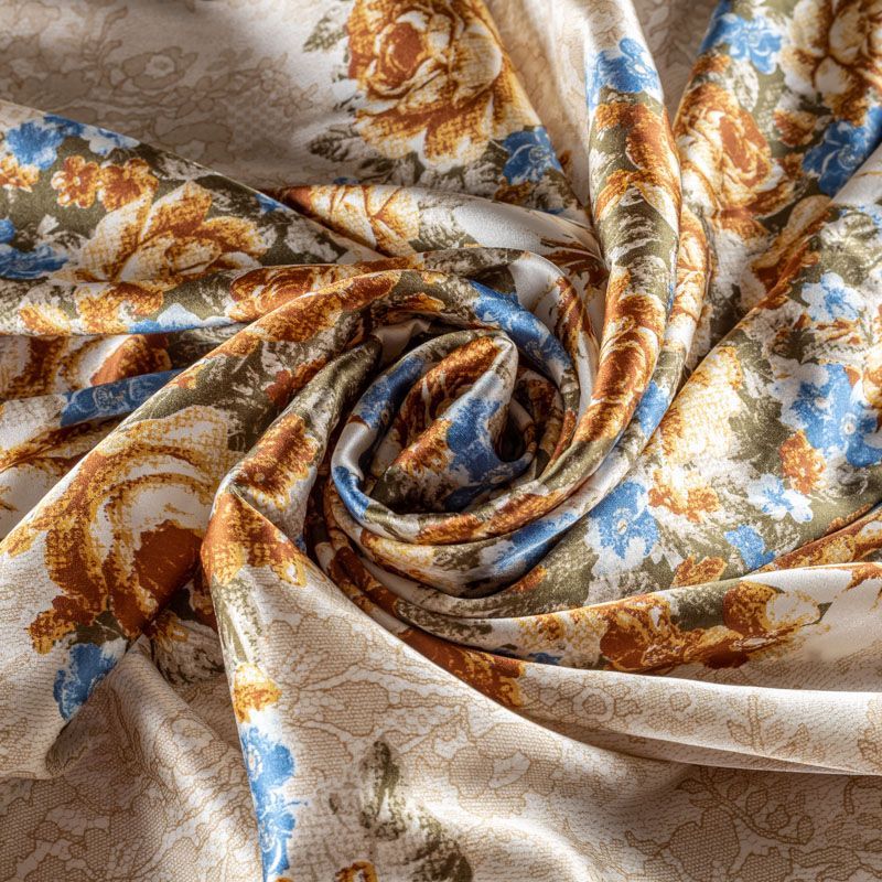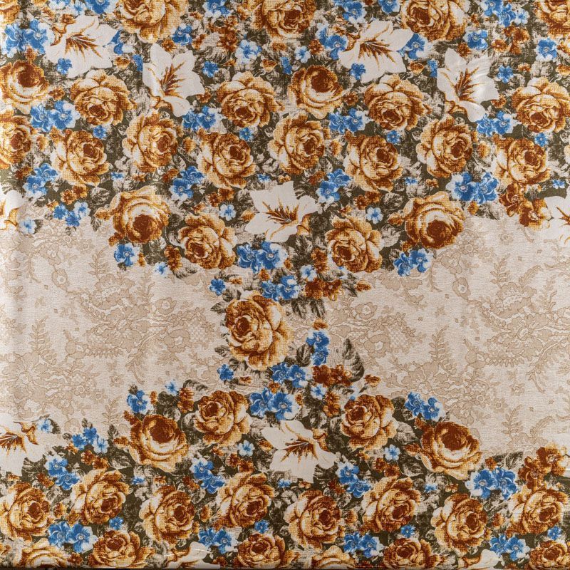 Итальянский матовый шелк с матовой поверхностью, легкий, струящийся, хорошо драпируется. Изысканное сочетание цветочного принта в коричнево-синих оттенках с имитацией нежного тонкого кружева подойдет для пошива летнего сарафана, платья, блузки, костюма в пижамном стиле, широких брюк или юбки.
