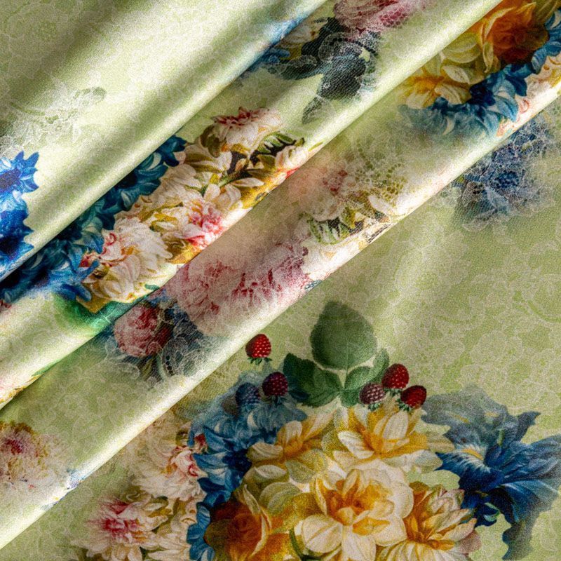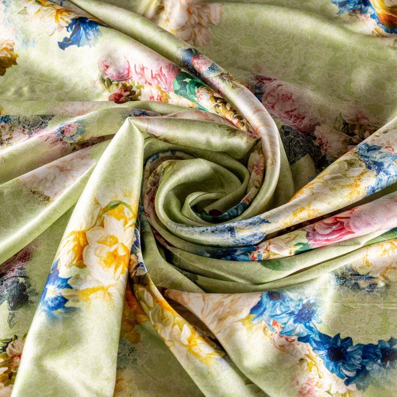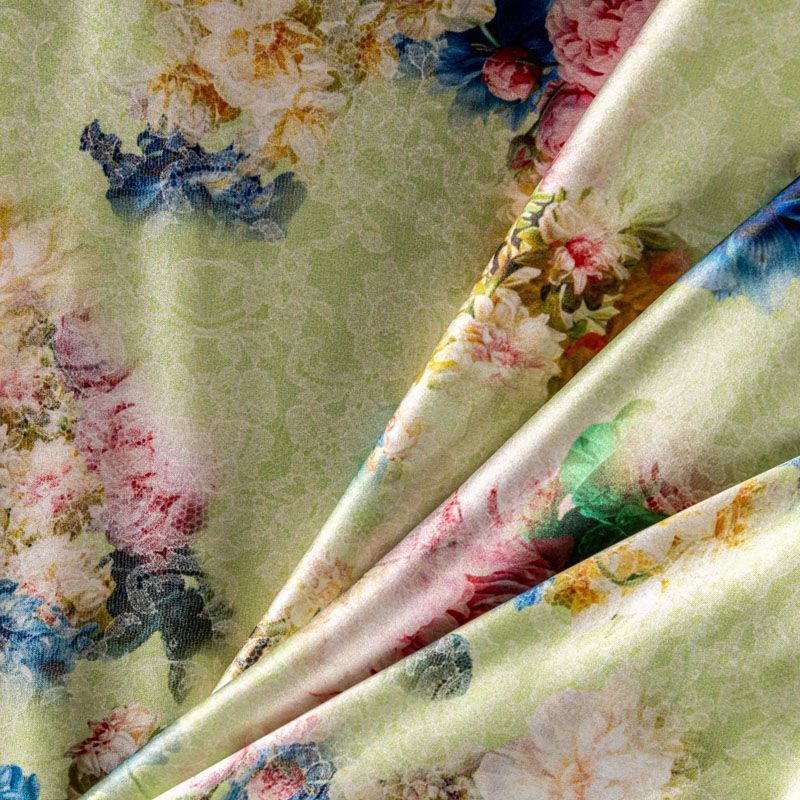 Итальянский атласный шелк с цветочным принтом на светло-салатовом фоне, имитирующем факту изысканного кружева, тонкий, слегка прозрачный, отлично драпируется,  легкий и струящийся. Идеально подойдет для пошива платьев и сарафанов расклешенных моделей, с воланами, летящих юбок, топов, блузки, костюма в пижамном стиле.