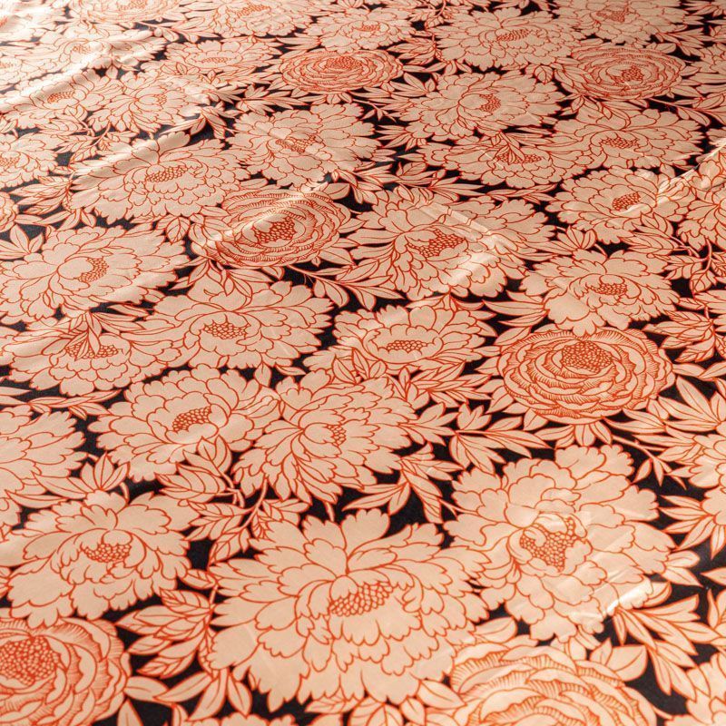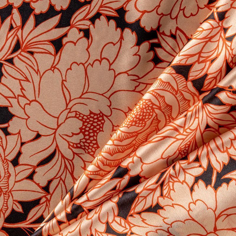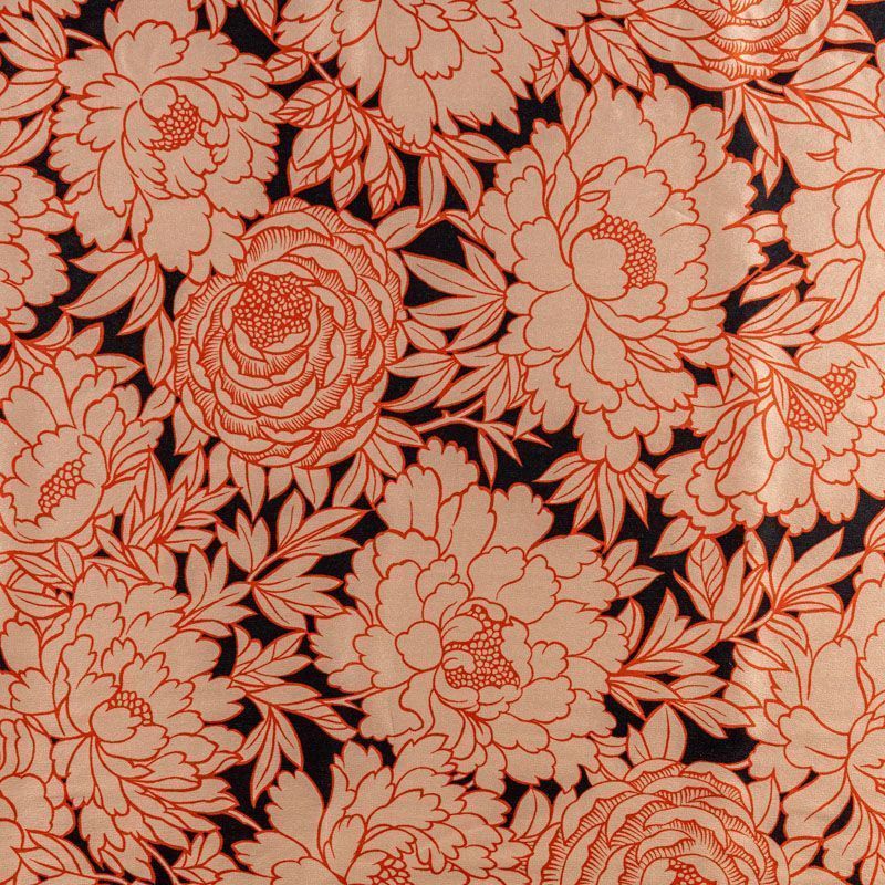 Итальянский атласный шелк с изящно прорисованными цветами в коралловых оттнках на черном фоне. Ткань тонкая, слегка просвечивает, струится, хорошо драпируется. Поверхность глядкая, имеет благородный сатиновый блеск. Подойдет смелых образов: летних платьев и сарафанов, как летящих фасонов, так и скроенных по косой, накидок, юбок, блузок, костюмов в пижамном стиле, туники, широких брюк, домашней одежды.