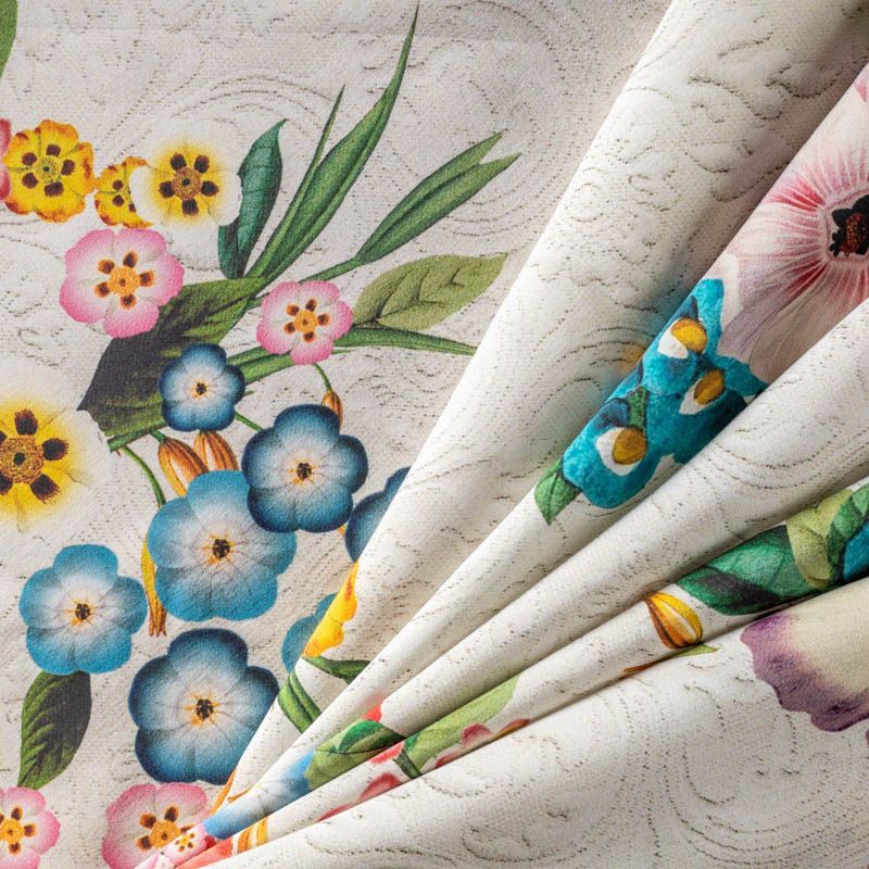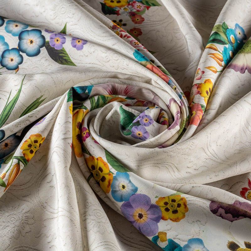 Итальянский атласный шелк с ярким цветочным принтом на фоне, имитурующем жаккардовый узор. Ткань средней плотности, не просвечивает, струится, хорошо драпируется. Поверхность гляпдкая, имеет благородный сатиновый блеск.  Подойдет для летних платьев накидок, юбок, блузок, костюмов, широких брюк, домашней одежды.